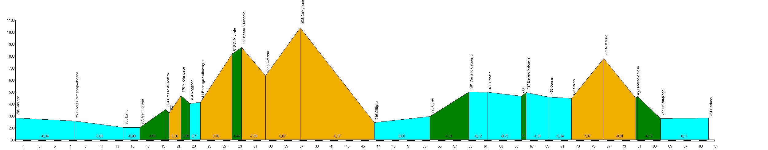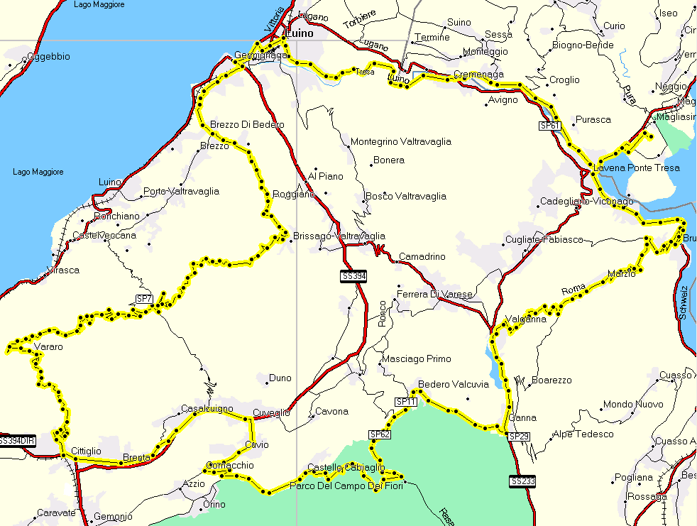 Percorso effettuato il 14 marzo 2007. Il seguente giro nel varesotto che vi propongo ora non è certo una passeggiata: né chilometraggio né dislivello sono elavatissimi ma alcune salita che verranno affrontate si faranno decisamente sentire nelle gambe. Se avete però una buona condizione o se avete rapporti molto corti, penso che potrete apprezzare queste belle stradine tranquille spesso nel bosco e decisamente povere di traffico. Km 0:Primi chilometri senza difficoltà: a Ponte Cremenaga supero la dogana e mi porto sull'altra sponda del fiume Tresa. Questo mi permette di evitare la breve salita che porta a Fornasette...giusto per potermi riscaldare come si deve prima delle salite vere. Arrivo a Luino e quindi a Germignaga. Km 16: Qui si affronta la prima asperità di giornata salendo verso Brezzo di Bedero. Le pendenze non sono mai a due cifre e raggiungono al massimo l'8-9%. Poco dopo lo scollinamento svolto a sinistra, breve discesa e brusca risalita verso il Villaggio Olandese. La salita non è lunga ma le pendenze sono sempre piuttosto elevate: 9-11% con alcuni passaggi al 12-13% nel finale. Il traffico è generalmente nullo ma la strada è particolarmente stretta e tortuosa rendendo gli incontri con le auto leggermente difficoltosi. Anziché svoltare a sinistra verso il Villaggio Olandese si prosegue ancora in salita prima di affrontare una breve discesa verso Roggiano. All'ingresso del minuscolo paesino si svolta a destra e si passa attraverso una strettissima strada. All'uscita di Roggiano mi accoglie un breve ma impegnativo tratto in pavé posto in leggera salita. Si arriva poi presto attraverso qualche sali e scendi a Brissago Valtravaglia. Km 24: A questo punto si comincia veramente a fare sul serio...il Passo del San Michele è una salita che può veramente fare male, visti i pochissimi tratti di respiro che concede e viste le pendenze anche fino al 17-18%. La salita inizia abbastanza decisa...pendenze all'8-10%. Ad un certo punto sulla sinistra della sede stradale s'intravede un cancello pitturato di rosso che preannuncia l'inizio del tratto più impegnativo della salita: due chilometri con pendenze quasi mai sotto il 10% e con un passaggio velenoso al 18% lungo un rettilineo. La pedalata si fa chiaramente più affannosa ma il 30x28 che monto mi permette comunque di salire senza troppi problemi. Le pendenze calano un poco prima di arrivare al paese di San Michele...tratto semipianeggiante e di nuovo un chilometro scarso di salita relativamente impegnativo. Lungo l'ascesa non incontro nemmeno un'automobile: la strada è veramente poco frequentata...attenzione però alla discesa per via della strada non sempre in buone condizioni, molto stretta e ricca di curve strette. Km 32.5:Finita la discesa, svoltando a sinistra, vi sarebbe la possibilità di scendere verso Arcumeggia. Svolto invece a destra ed a breve ricomincio a salire in direzione Passo Cuvignone. Questa salita non è dura come il San Michele ma è sempre decisamente impegnativa. Le pendenze sono spesso al 9-10% ed i passaggi al 12-14% non sono proprio rarissimi. Fortunatamente ci sono anche tratti più facili che permettono di riprendere fiato. Si svetta agli oltre 1000 metri del Cuvignone per poi affrontare una lunga e abbastanza piacevole discesa verso Cittiglio...meglio comunque prestare un po' di attenzione per via della strada non larghissima e per via di alcune curve-semicurve abbastanza cieche. Terminata la discesa posso finalmente affrontare un po' di pianura tra Cittiglio, Brenta e Cuvio. Km 54: La strada comincia a risalire...ma ormai le vere difficoltà sono alle spalle. Le pendenze non superano l'8%. Alla rotonda di Comacchio svolto a sinistra immettendomi in una bella stradina che risale in mezzo al bosco abbastanza dolcemente fino a Castello Cabiaglio e poi Brinzio. Allo stop giro a sinistra e dopo poco affronto una breve discesa prima di svoltare ancora, questa volta a destra, per riportarmi a Bedero Valcuvia. Ancora pochi chilometri ed arrivo a Ganna...affronto un breve e brutto tratto di statale fino a Ghirla prima di svoltare a destra. Km 72.5: Si ricomincia nuovamente a salire con decisione...rampa subito secca all'uscita del paese di Ghirla seguita da un tratto un po' più facile. Le pendenze si assestano in seguito tra il 9-10%: nessun tratto veramente impegnativo ma pure pochi tratti che permettono di rifiatare veramente. Le pendenze diminuiranno chiaramente solo nel finale, superato il bivio che porta verso Boarezzo. Dopo lo scollinamento del Monte Marzio si deve affrontare una discesa piuttosto insidiosa. Poco prima di arrivare ad Ardena ci sono un paio di passaggi veramente stretti e completamente ciechi, quindi massima attenzione. Dopo una brevissima risalita la strada ricomincia a scendere verso il lago fino a Brusimpiano...ancora pochi chilometri e sono nuovamente a Caslano dopo avere effettuato questo impegnativo ma decisamente bel giro nel Varesotto, questo soprattutto per le strade poverissime di traffico. |