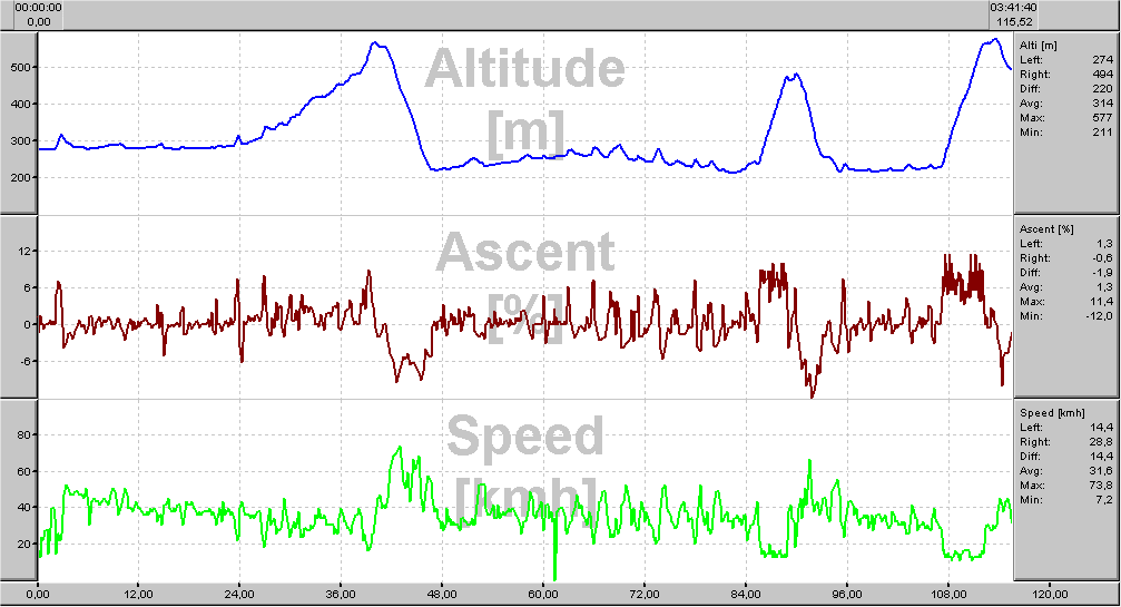 Questi i dati del mio Ciclocomputer CM414. Tempo impiegato: circa 3:40, velocità media 31,5 km/h, potenza media 203 WATT.