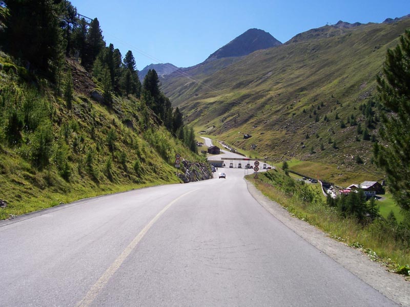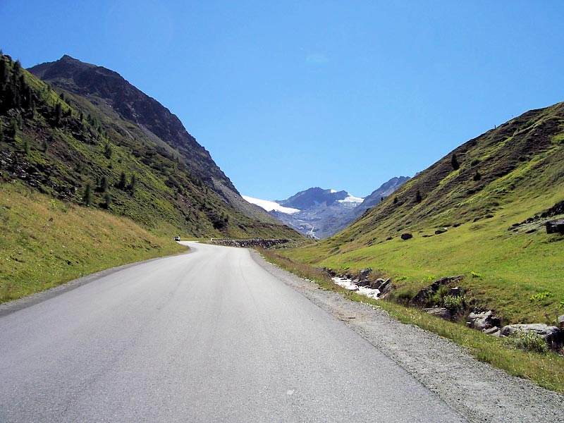 Finalmente arriva il momento della tappa più attesa dell'intera vacanza, la Sölden-Timmelsjoch (Passo Rombo)-Sölden-Tiefenbachferner (ghiacciai di Sölden)-Sölden. Non è sicuramente il chilometraggio a fare paura ma bensì i quasi 3000 metri di dislivello e soprattutto la durissima salita finale che ci porterà fino ai ghiacciai di Sölden, una vera arrampicata con pendenze quasi sempre tra il 10-13% ed arrivo ad altissima quota a circa 2800 metri d'altitudine. Cominciamo la lunga ascesa del Timmelsjoch senza alcun riscaldamento visto che la prima parte della salita offre diversi tratti decisamente pedalabili ma anche già qualche strappo piuttosto esigente. I primi sedici chilometri di salita che portano al casello (i veicoli devono pagare un bel po' di euro per valicare questo passo) non offrono un granché dal punto di vista paesaggistico. Proprio dal casello si possono però ammirare a picco la valle da cui siamo saliti pochi minuti prima così come le imponenti montagne circostanti. Dopo una breve discesa il paesaggio si fa piuttosto selvaggio, con solo prati e pietre intorno a noi. Un infinito rettilineo di quasi tre chilometri spazzato da un fastidioso vento contrario mi mette a dura prova ma fortunatamente la gamba risponde ancora bene. Le pendenze sono spesso all'8-10% con qualche rampa al 12%, ma è soprattutto il vento a rendere duri questi ultimi chilometri. Man mano che si sale, in alto sulla sinistra della montagna si comincia a scorgere il valico del Rombo: ancora qualche tornante e si giunge ai circa 2500 metri d'altitudine e così anche il Timmelsjoch è conquistato. Dopo una pausa e qualche fotografia ricordo siamo pronti per la veloce discesa su Sölden, interrotta dalla contropendenza che porta al casello e da alcuni altri tratti semi-pianeggianti. Nel rettilineo di quasi tre chilometri, grazie alle buone pendenze ed al vento favorevole, sfioro i 90 km/h. A questo punto ci aspetta ancora la salita assassina dei ghiacciai e dopo aver mangiato un bel piatto di spaghetti poco sopra Sölden ricominciamo a pedalare un po' intimoriti per l'ultima asperità di giornata. Le pendenze sono subito a due cifre: in pratica nella prima metà della salita si attestano costantemente tra il 10% ed il 13% con pure qualche breve passaggio al 15%. Nulla di paragonabile a Mortirolo o altre salite estreme…il problema è la continuità di queste pendenze che alla lunga ti tolgono veramente il fiato. Fino al casello (anche qui i veicoli devono pagare qualche euro per raggiungere la vetta) si pedala su uno stradone prevalentemente nel bosco. Dopo una brevissima discesa si giunge al casello e si apre davanti ai nostri occhi uno scenario veramente spettacolare, con già ben visibile all'orizzonte il maestoso ghiacciaio Rettenbachferner. Nonostante l'altitudine (siamo sopra i 2000m) comincio a sudare un bel po'...non solo per la durezza della salita ma anche per via della strada ora completamente esposta al sole. Un infinito ed in parte durissimo rettilineo mi fa quasi collassare ma per fortuna nel finale le pendenze sono un po' più umane. Ad oltre 2600 metri la strada si biforca: a destra si prosegue verso il ghiacciaio Rettenbachferner mentre a sinistra verso il Tiefenbachferner. Optiamo per quest'ultima variante e dopo una brevissima discesa entriamo in una lunga, gelida e ben illuminata galleria. Alla sua uscita si culmina a ben 2829 metri d'altitudine…si tratta della strada alpina asfaltata che tocca il punto più alto. Breve discesa e si arriva alla stazione sciistica del Tiefenbachferner...e così anche questa micidiale salita è stata conquistata, sebbene con molto affanno ma pure altrettanta somma soddisfazione. |